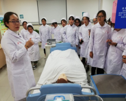 在康复治疗专业员工参观学习过程中,康复科医生首先向大家介绍了康复治疗的工作任务,即在病人临床治疗完成后,帮助病人有尊严地融入到人群中,用尽一切方法和手段尽可能让病人身体恢复到患病前的状态,身体功能没有障碍,而对于高龄人群而言,康复则是让他们的生活可以自理;另外还给同学们介绍了康复治疗常用的一些操作及设备,让大家对康复治疗工作有了进一步的认识。而护理这边,主要参观了呼吸科和心血管内科病房,科室护士长们向同学们介绍了本科室概况,以及护士的主要工作方式和工作职责,之后带大家参观并介绍了护士站、治疗室、操作室及部分病房的功能和设置,另外还近距离参观了护理模型,同时护士长针对一些简单的护理操作,给大家作了详尽介绍。