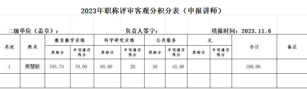 现将医公司2023年讲师职称评审客观分积分表予以公示,公示期为3天(2023年11月6日-8日),公示期间如有异议,请向医公司专业技术职务评审工作小组反映,电话号码:0915-3260251。