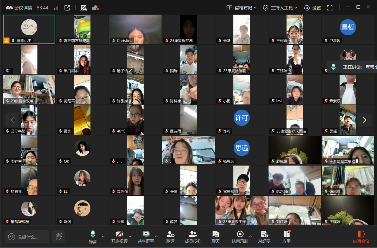 为进一步加强员工对考研的认识和了解,明确考研规划和目标,营造良好的考研学习氛围,2025年10月24日晚公司在腾讯会议举办线上“医路研途”学长学姐考研经验分享会。活动邀请22届康复治疗学专业员工张跃跃、25届护理学专业员工蔡修燕作交流分享,大三全体员工参加。会议由学工办主任董弯主持。
