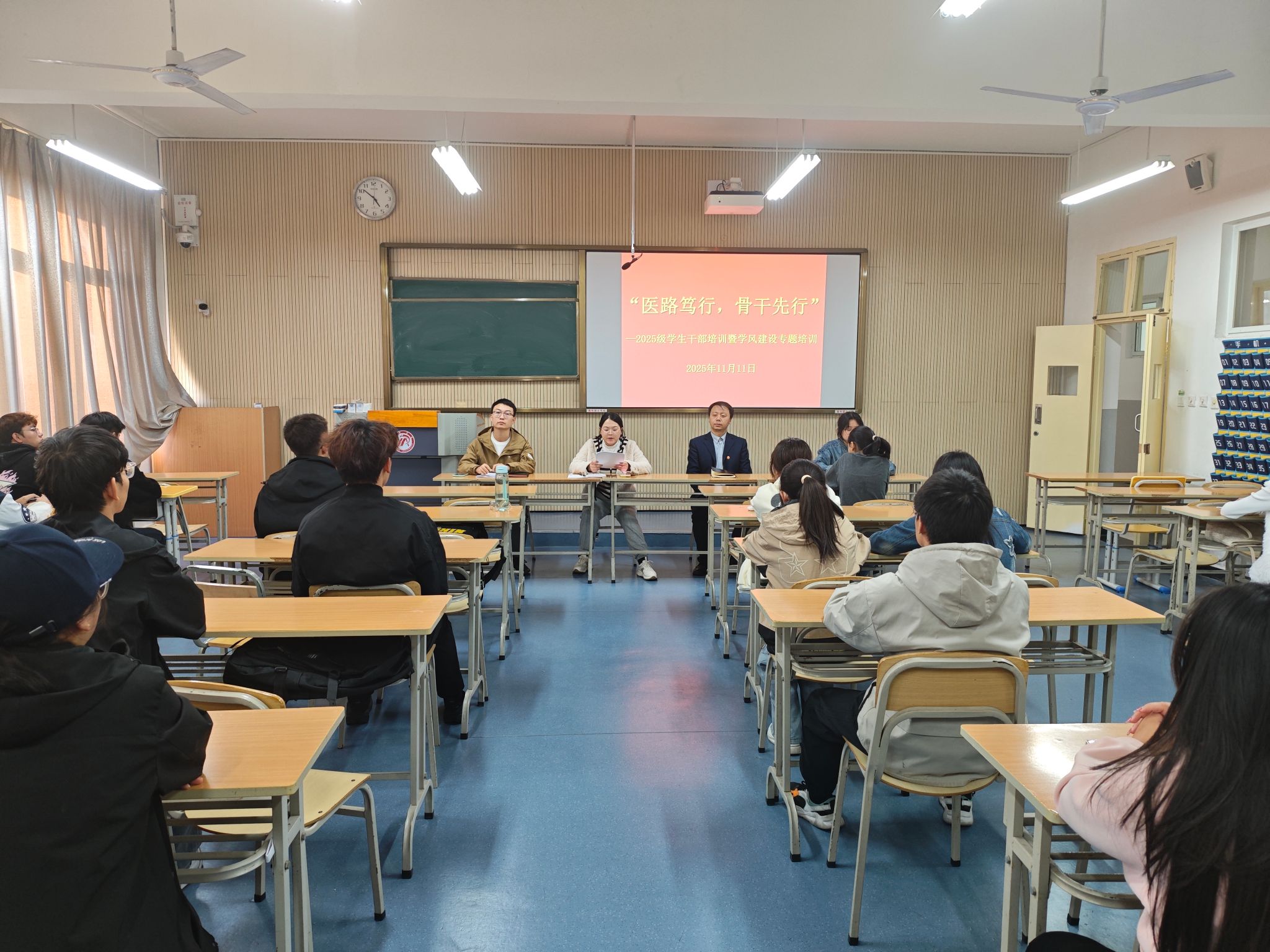 为加强新生班级和宿舍建设,提升员工骨干的综合素养与履职能力,11月11日下午,公司组织2025级员工干部、各宿舍舍长参加干部培训,医公司党总支书记黄勇,学工办主任董弯,辅导员桑杰,晁一雯参加会议。